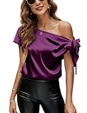 VIDUSSA Blusa de seda con hombros descubiertos para mujer, informal, manga corta, cuello asimétrico, blusa de satén, Púrpura, Large